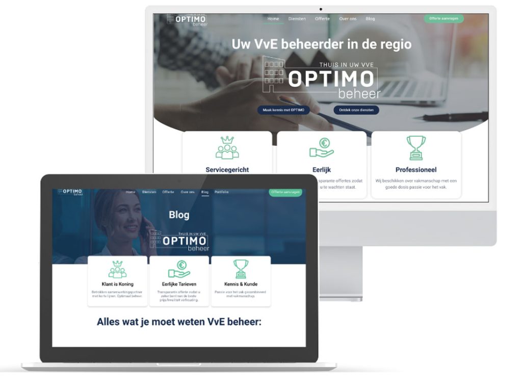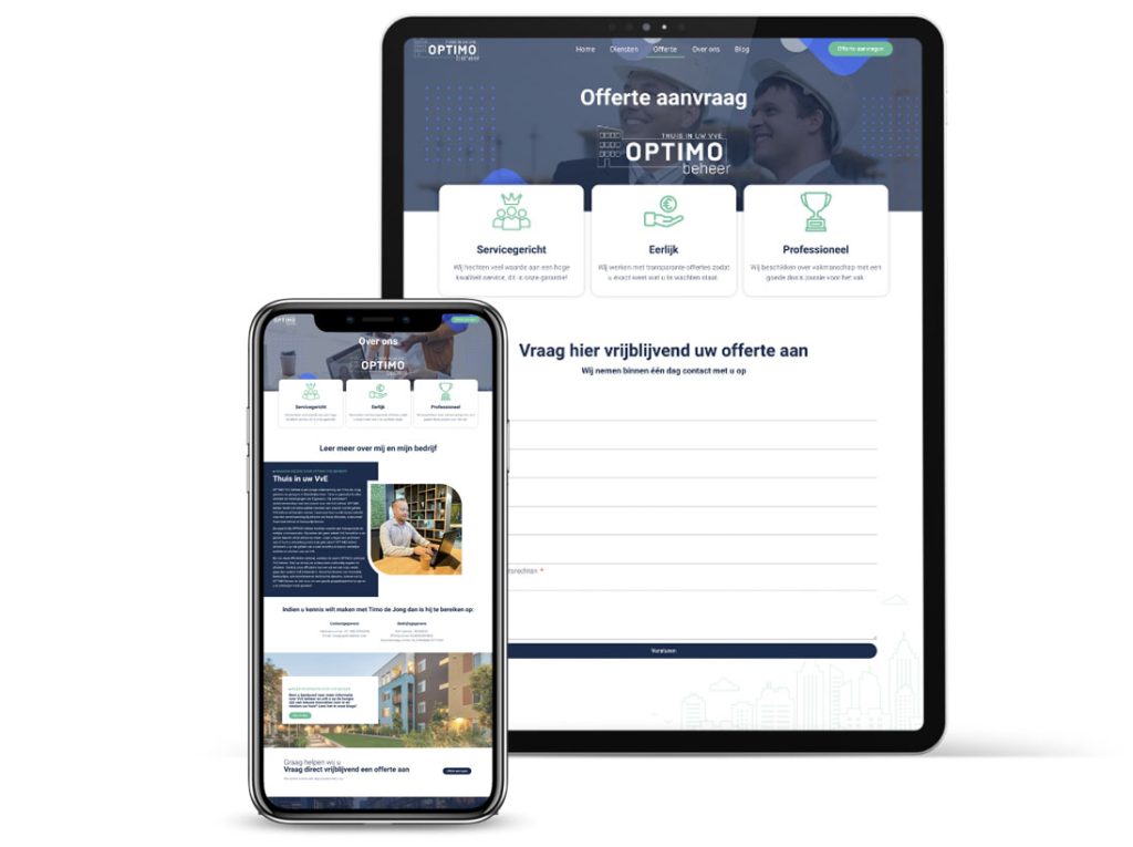 OPTIMO VvE Beheer is het bedrijf van Timo de Jong. Hij is recent gestart met deze onderneming. Zelf had hij al een simpele website gemaakt, maar hij heeft ons benaderd om dit naar een hoger niveau te tillen. Daarbij wilde hij ook beter vindbaar worden en een aantal ads campagnes starten. Voor dit laatste moesten er uiteraard ook aantrekkelijke landingspagina’s komen die de website bezoekers warm zouden maken voor conversie.